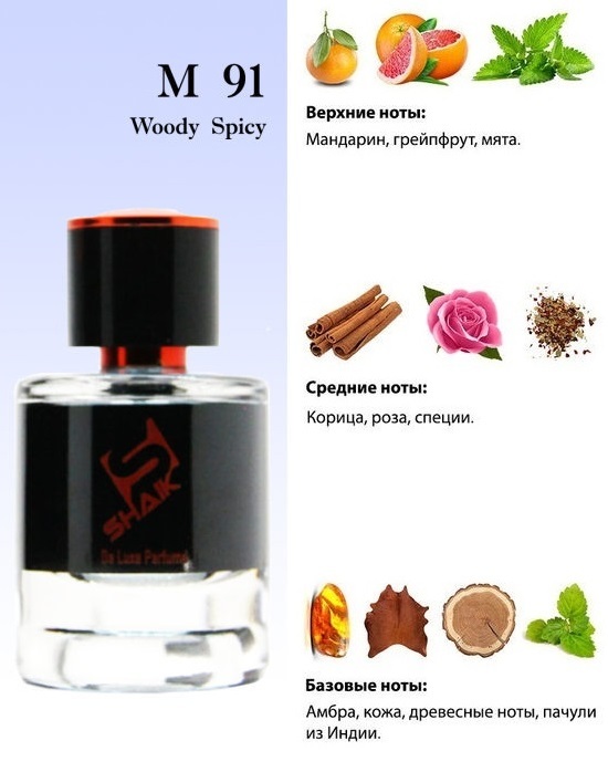 Потрясающий и обольстительный мужской аромат. Принадлежит к группе ароматов древесные пряные. Завораживающий аромат сводит с ума своим сочетанием роскоши и богатства, власти и силы. Shaik M91 - аромат, предназначенный для уверенных в себе, харизматичных и достойных мужчин, которые всегда верны своему слову и своим принципам. Начальные ноты композиции аромата открываются аккордами мяты и грейпфрута. Насыщенные сердечные ноты состоят из ароматов пряностей, розы и корицы. Завершается композиция танцем из нот белой древесины, амбра и кожи.