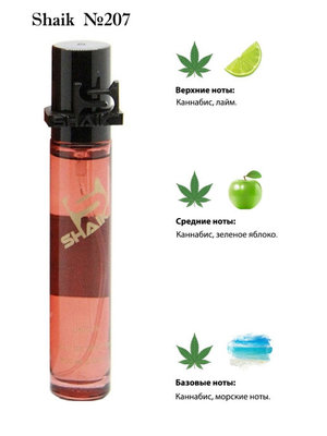Парфюмерия Shaik обогащена эфирными маслами, благодаря чему имеют стойкость аромата до 48 часов.Сочетает в себе свежесть лайма, дикого зеленого яблока, морские ноты и конечно же яркие волшебные мелодии листвы мариджуаны.Не вульгарный, стойкий, ни на что не похожий аромат. Очень интересный и привлекательный. Любовь с первой ноты. Подходит для мужчин и женщин.Ароматы относятся к духам и обогащены эфирными маслами.