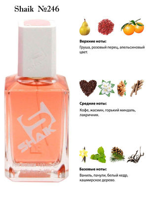 Парфюмерия Shaik обогащена эфирными маслами, благодаря чему имеют стойкость аромата до 48 часов. Начальные ноты розовый перец, апельсиновый цвет. Ноты сердца кофе, жасмин. Базовые ноты ваниль, пачули, кедр. Начальные аккорды композиции раскрываются розовым перцем, апельсиновым цветом и грушей. Через несколько минут к ним присоединяются нотки ароматного кофе и душистого жасмина. Основу шлейфа составляют вкрапления пряной ванили, пачули и смолянистого белого кедра. Роскошный, насыщенный и очень глубокий аромат. Его звучание ассоциируется с запахом ночи, которая таит в себе неизведанные чувства и азарт. С ним хочется рисковать и достигать своей цели, невзирая на любые препятствия. Ароматы относятся к духам и обогащены эфирными маслами. Конкурентное окружение Yves Saint Laurent Black Opium.
