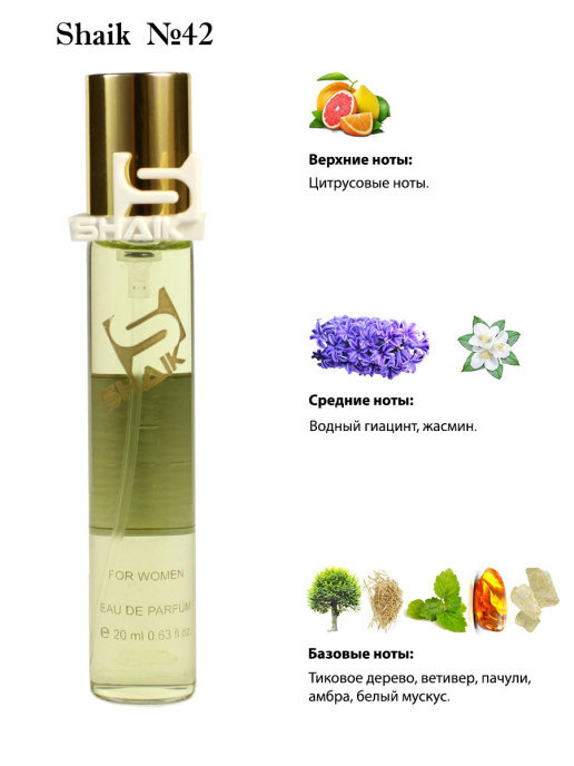 Парфюмерия Shaik обогащена эфирными маслами, благодаря чему имеют стойкость аромата до 48 часов. Верхние ноты: цитрусы.Ноты сердца: водный гиацинт, жасмин.Базовые ноты: тиковое дерево, амбра, пачули, ветивер, белый мускус. Аромат наполняет уютной легкой свежестью цитрусовых, обдает нежнейшим дуновением водного гиацинта, окружает ненавязчивой прохладой и пьянит. Невероятно воздушный, но стойкий шлейф деликатно обволакивает древесно-мускусными нотками, усиливая аккорд волшебного жасмина, который звучит в самом сердце парфюма. Чувственные оттенки пачули и теплой смолистой амбры добавляют парфюму глубины и теплоты звучания Ароматы относятся к духам и обогащены эфирными маслами. Конкурентное окружение: Chanel Chance Еаu Fraiche.