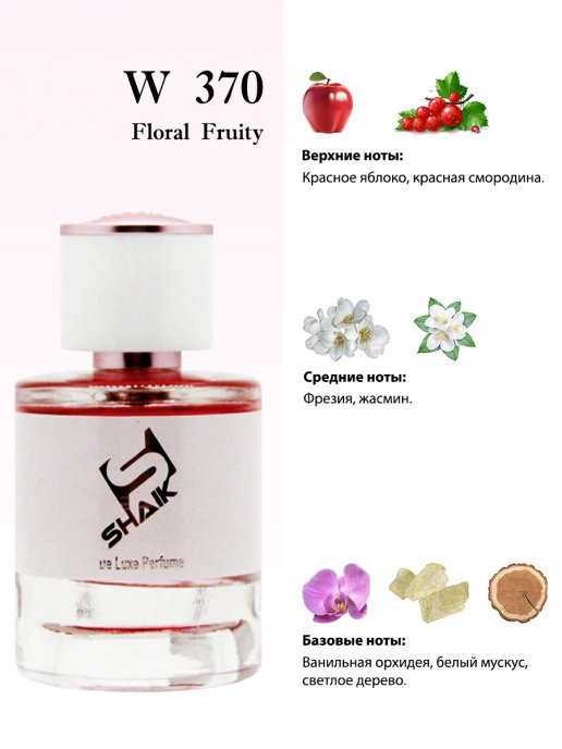 Shaik W370 - нежный, романтичный аромат для прекрасных мечтательниц готовых к приключениям. Композиция начинает раскрываться с гармоничного сочетания красного яблока и красной смородины. В сердце расположились цветочные мотивы белой фрезии и обольстительного жасмина. Стойкий шлейф играет аккордами белого мускуса, светлого дерева и изящной ванильной орхидеи.