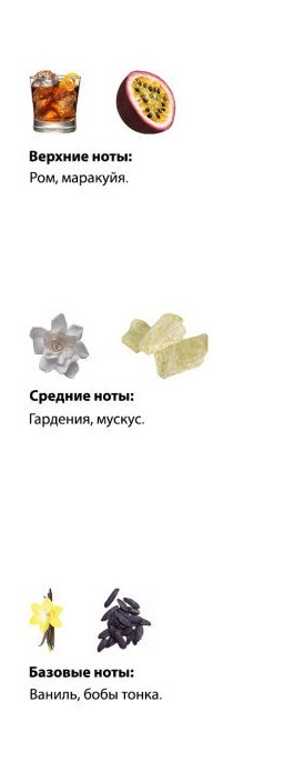 Мягкий, теплый аромат обволакивает с первых нот, оставляя терпко-сладкое послевкусие. Духи женские относятся к семейству восточные гурманские. Верхние ноты раскрываются сочной маракуйей и душистым пряным ромом, плавно переходя в терпкие мускусные ноты и нежную и тонкую гардению. Шлейфовость аромату придает пудровая ваниль и бобы тонка в базе.Ароматы относятся к духам и обогащены эфирными маслами. Конкурентное окружение: Carolina Herrera 212 vip.